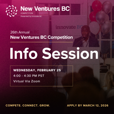 By registering for this event, you consent to receive email communications from New Ventures BC, including our e-newsletter and updates about programs and events. You may unsubscribe at any time. By attending, you acknowledge that photos and videos may be taken and used by New Ventures BC for marketing and promotional purposes.