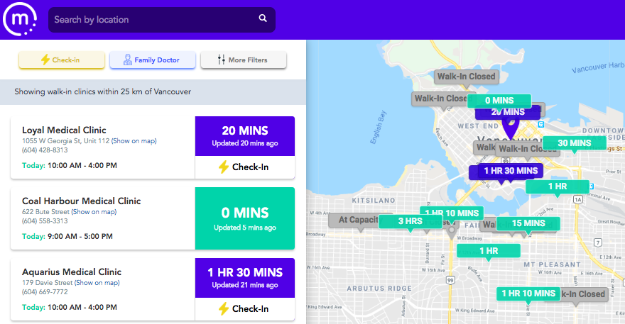 Their website, medimap.ca, lets patients look up wait times at over 50% of the walk-in medical clinics across Canada and join the clinic’s wait list remotely to spend less time in the waiting room.